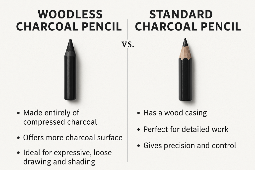 When choosing a charcoal pencil, you’ll typically come across two main types: woodless and standard charcoal pencils. While both can produce similar artistic results, the key differences lie in their design and the experience they offer during use: